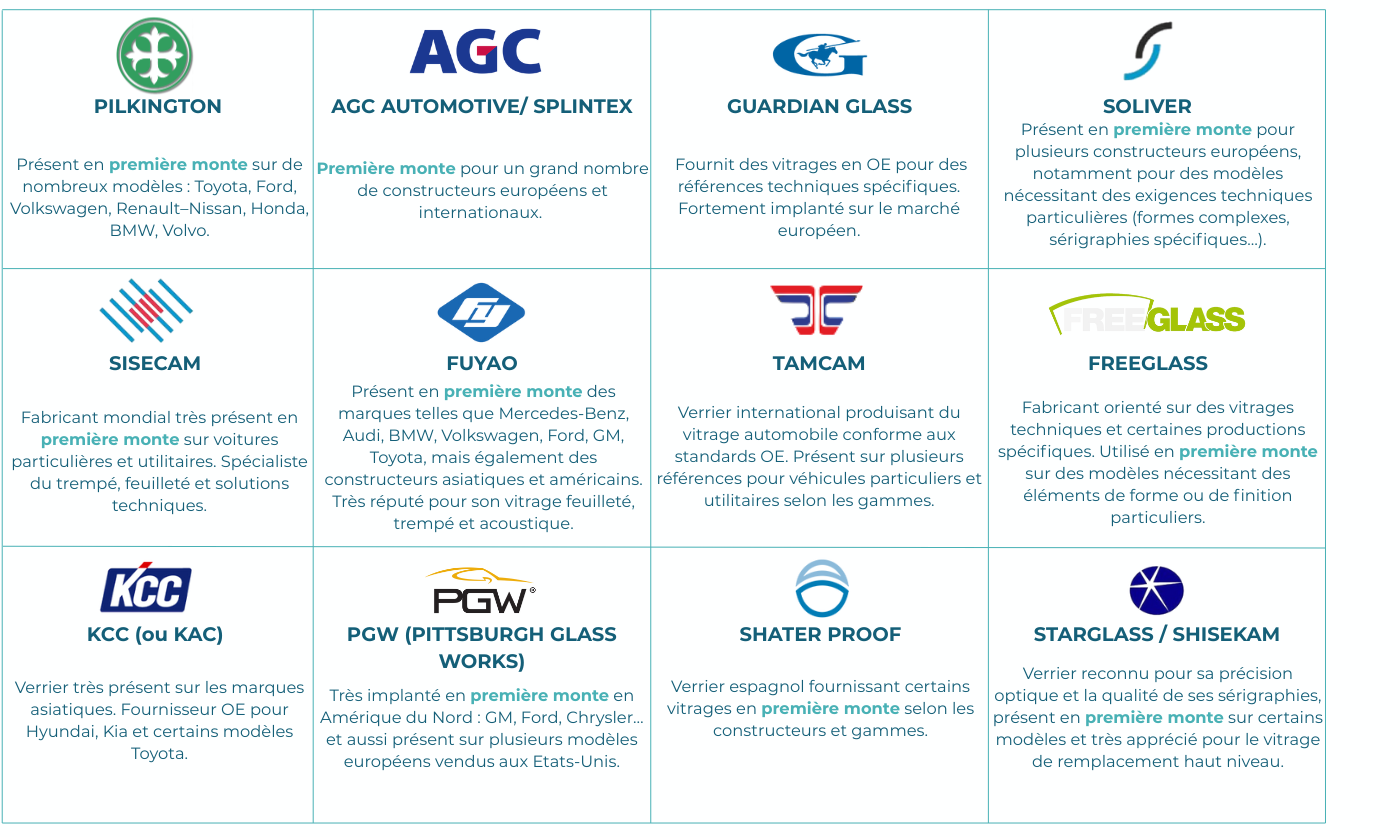 Chez Sekurit Service, notre priorité est de vous proposer des vitrages fiables, sûrs et parfaitement adaptés à votre véhicule. Pour vous garantir une large disponibilité et une qualité équivalente à l’origine, nous travaillons également avec d'autres verriers reconnus dans le monde entier, dont plusieurs fournissent directement les constructeurs automobiles pour la première monte (OE).